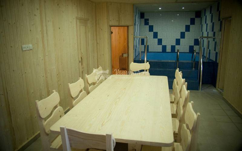 Ещё и миниатюрный телевизор прикреплён под самый потолок, увеличительной лупы не хватает, чтоб смотреть его. Да и сидя за столом это крайне неудобно смотреть телевизор задрав голову под потолок. Шея устаёт, выпить и съесть ничего не возможно,когда голова так задрана. Вот вообще бы лучше не вешали, а просто радео прикрутили. Никогда больше не прйдём в эту баню! Никому не советую!
